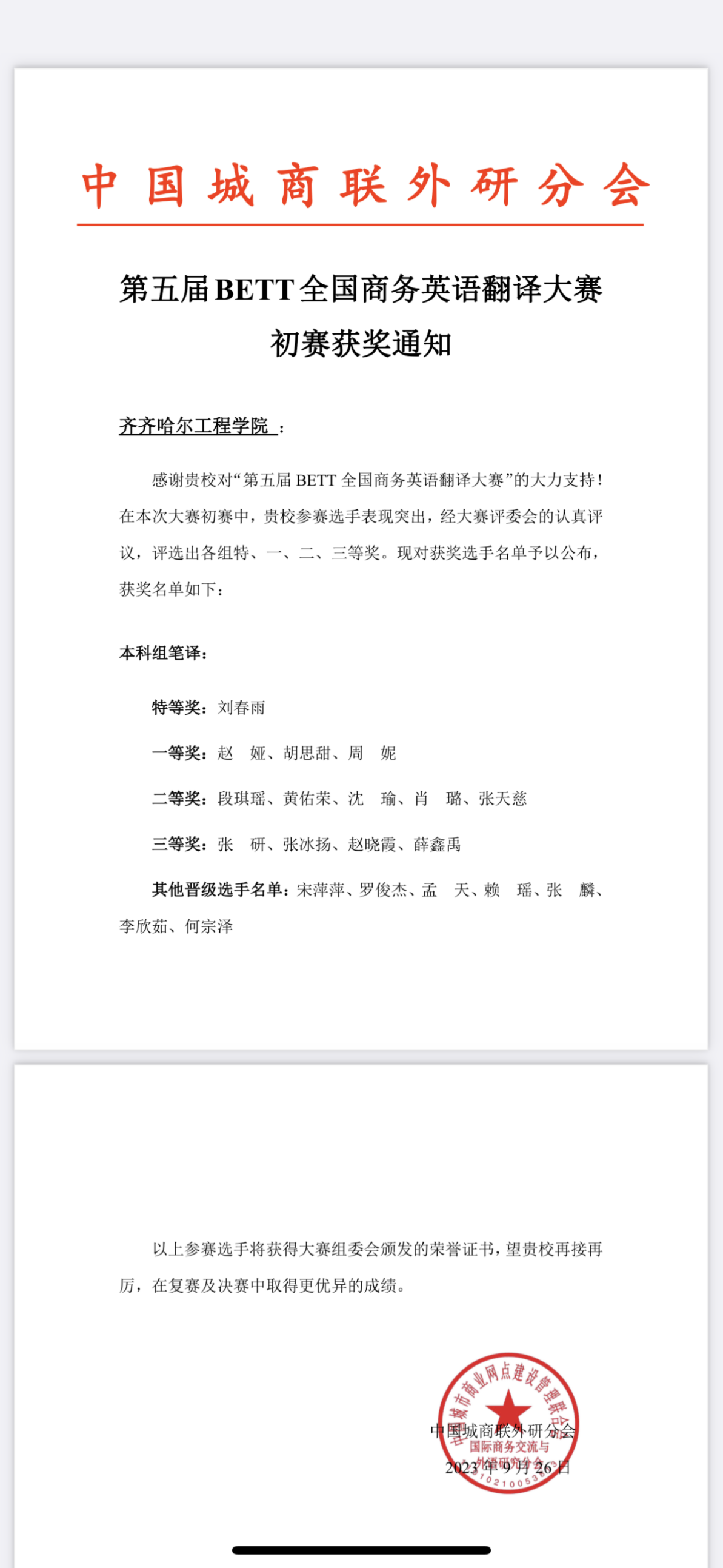 7月26日,2023全国大学生国际贸易挑战赛结束,学校管理工程系英语专业共有4名学生获二等奖,14名学生获三等奖。 比赛由中国欧洲经济技术合作协会一带一路经济文化委员会主办,讲知堂(北京)文化传媒有限公司承办。我...