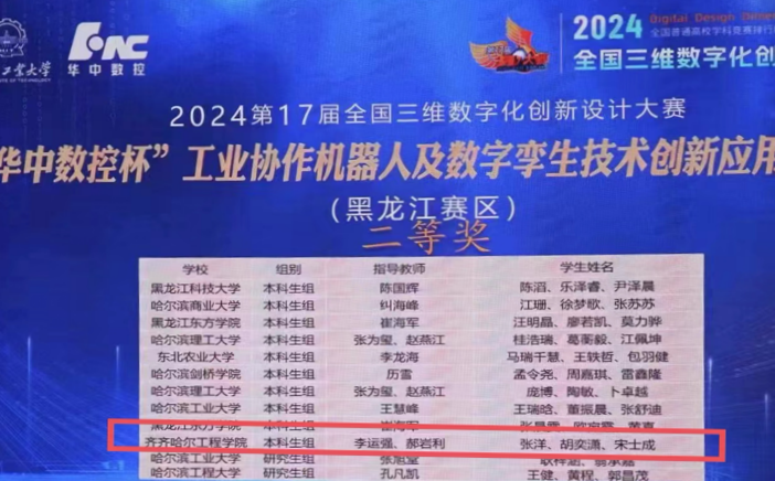7月13日,第17届全国三维数字化创新设计大赛“华中数控杯”黑龙江赛区决赛传来喜讯,永利机电工程系机械设计制造及其自动化专业学生张洋、胡亦潇、宋士成团队荣获二等奖;王重阳、高月童、刘正杨团队及刘展、刘麟松、董思彤团队分别荣获三等奖。该项赛事隶属于全国大学生学科竞赛56项赛事之一,本届比赛由黑龙江省普通高等学校创新创业教育指导委员会主办,于 7月 12 日至 13日,在哈尔滨工业大学举办。下一步,机电工程系将...