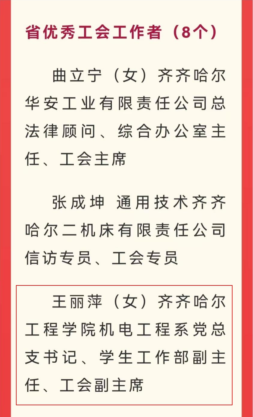 日前,黑龙江省总工会颁发了《黑龙江省总工会关于表彰省模范职工之家、省模范职工小家、省优秀工会工作者的决定》,学校工会副主席王丽萍榜上有名,荣获省优秀工会工作者荣誉称号。