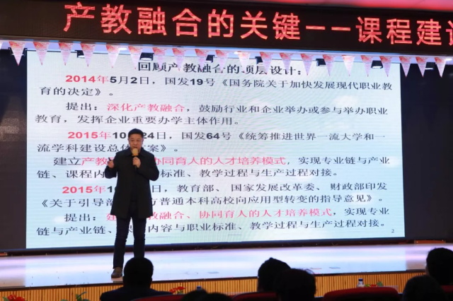 曹勇安教授在报告中对中外高等教育发展历程进行简要回顾,基于我国传统文化对“文化”“学校”“教师”“课程”“人才”做出富有现实意义的诠释,从国家形势、社会需求等多层面分析了课程建设在整个人才培养中的重要性,提出了“结构决定功能,课改的关键是课程结构;解构学科教学体系,重构行动教学体系”的理念,指出落实“产教融合、校企合作”的关键是课程建设,并用“课程像老汤、设计是配方、教学是熬汤、评价是品尝”的生动比喻,将课程四要素(课程定位、课程设计、课程实施、课程评价)的关系阐释得精彩透彻,强调“产教融合,校企合作”是解决应用型院校人才培养的重要途径。