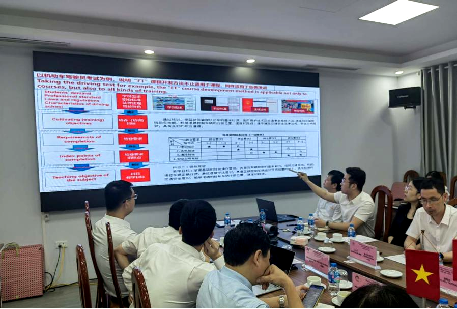 机电工程系副主任敖林喆以一门课程为例进行“FT(课程)”展示。考察团成员与参会各方就越南属地化人才培养、课程培训等事宜进行了深入交流。