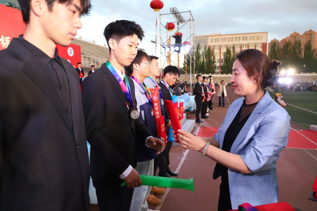曹勇安为丁香少年颁奖并讲话。他首先代表学校向支持学校工作的工友和全体师生表示衷心的感谢。指出,丁香花香远益清,苔花如米小,也学牡丹开,毕业的学子们要学习丁香精神,追求自己的梦想,如牡丹一样,花开遍地、芳香四溢。校园北区在建的人民会堂、游泳馆、体育馆、冰上运动馆将在九月份投入使用,它将为师生搭建“同学习、同运动、共成长”的平台,丰富学生的校园生活,提升身体素质,弘扬竞技精神。希望即将步入社会的学子,在未来的工作、生活中,具有创新精神,勇于探索,以实际行动践行学校“为融入社会走进来,为服务社会走出去”的教育理念。