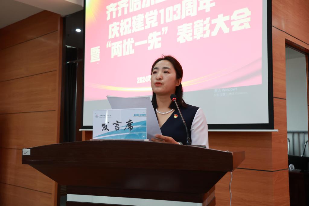 院长、党委副书记曹然彬主持会议。曹然彬在讲话中强调,各级党组织要及时传达落实会议精神,认真学习和领会讲话精神,学习先进集体和优秀个人的先进事迹,进一步把思想统一到学校发展战略上来,切实推动学校各项工作扎实开展;要以庆祝中国共产党建党103周年、党纪学习教育为契机,通过多种形式,掀起学先进、比贡献的热潮,激励广大党员干部进一步抢抓机遇、迎难而上,为学校华丽通过本科教育教学审核评估而奋力拼搏,为推动学校高质量发展作出新的、更大的贡献。