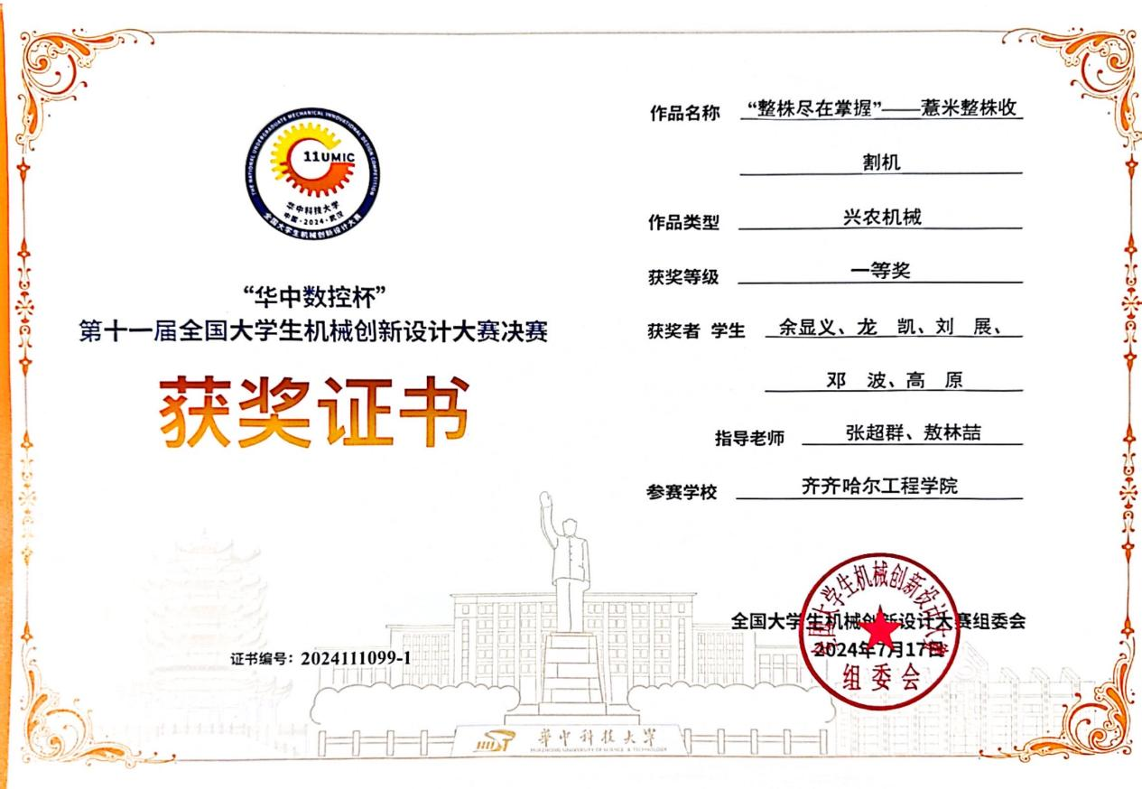 第十一届全国大学生机械创新设计大赛现场总决赛于7月16至17日在华中科技大学举行。学校机电工程系学生余显义、龙凯、刘展、邓波、高原的项目“整株尽在掌握”——薏米整株收割机,荣获全国一等奖。