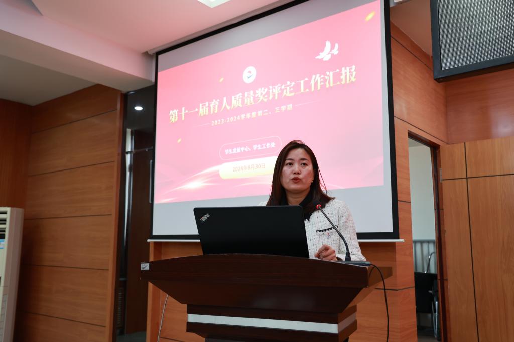 学生发展中心负责人康静作第十一届育人质量奖评定工作汇报,详细说明了评价标准、考核及奖励等情况,指出下一步工作方向:一是加强数智化建设,开展协同育人;二是落实教育家精神,完善“练五功”活动;三是加强“导员”对“导师”的管理评价;四是强化职能部门对生涯导师工作的支持力度。