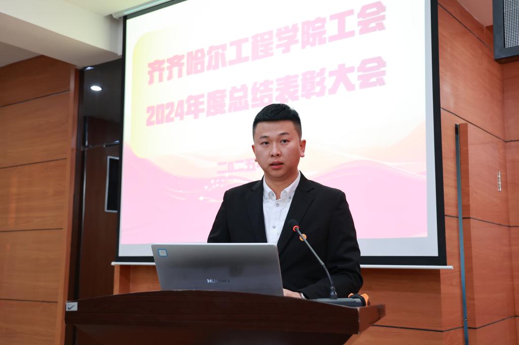 1月10日下午,学校工会2024年度工作总结暨表彰奖励大会在学校图书馆601报告厅召开。学校党政领导班子出席大会,学校党委委员、副院长、工会主席白雪,工会副主席王丽萍、学校工会委员以及各基层工会主席、优秀工会干部、工会积极分子和会员代表等200余位教职工参加会议。会议由学校工会委员张磊主持。