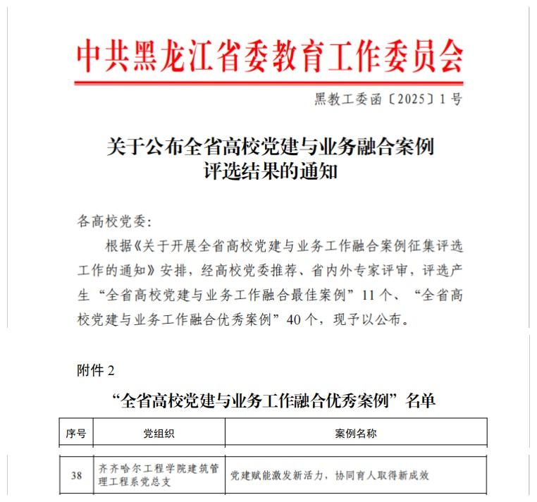1月13日,黑龙江省委教育工委组织的全省高校党建与业务融合案例评选结果公布,永利建筑管理工程系党总支的《党建赋能激发新活力,协同育人取得新成效》案例脱颖而出,获评优秀案例。