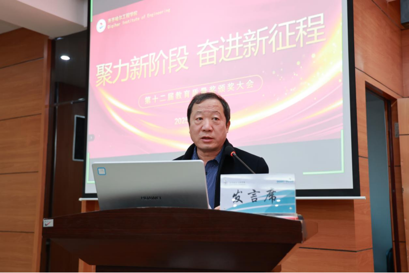 曹勇安代表学校向获奖教师表示热烈祝贺,向全校教职工及家人致以春节问候,并充分肯定了教师在教育教学工作中取得的成绩。他指出,2024年,学校的“双创”系列工作取得了优异的成绩,希望通过持续推进创新创业教育以及生涯导师制,培养更多齐工程学子投身创新创业实践,为提高人才培养质量打下坚实基础。展望2025年,学校将聚焦FT课程建设工作,积极向无纸化方向转型,依托学校自主研发的课程通平台,持续更新和优化课程建设内容,创新教学方法,不断提升教育教学质量,在奋进的新征程上,续写学校发展新篇章。