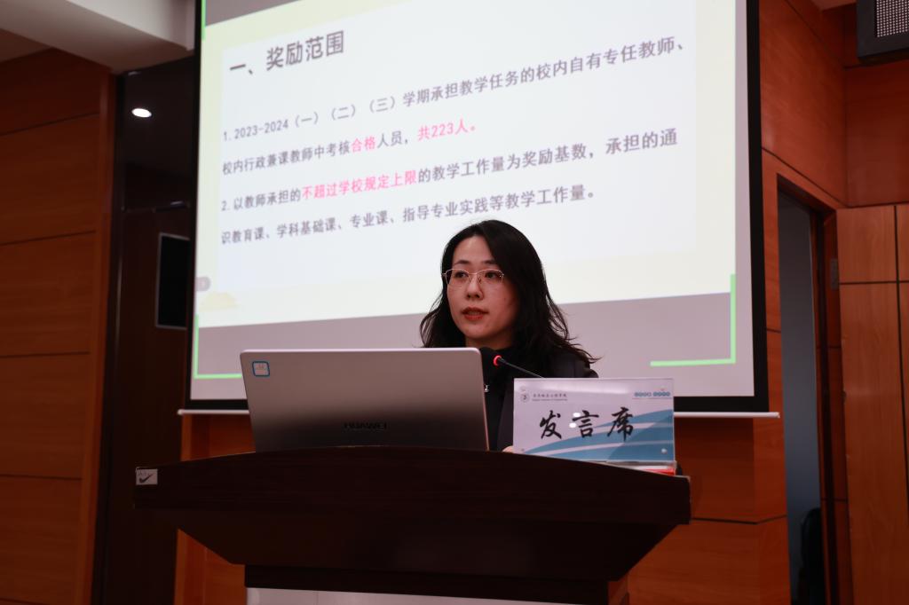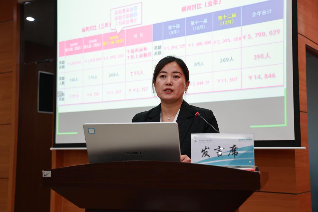 教务处副处长郝丽娜作第十二届教学质量奖汇报,介绍了奖励范围、奖励办法及奖励情况,并用图表与数据说明了全年奖励金额、人数和占比。指出本届教学质量奖评定侧重于高质量教科研成果和课程通建设等标准。