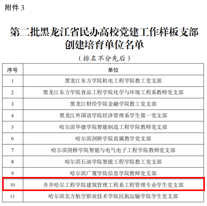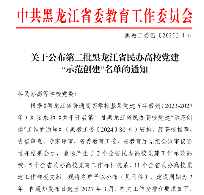 近日,黑龙江省委教育工委公布全省第二批民办高校党建“示范创建”评审结果,永利建筑管理工程系工程管理专业学生党支部获批党建工作“样板支部”培育创建单位。
