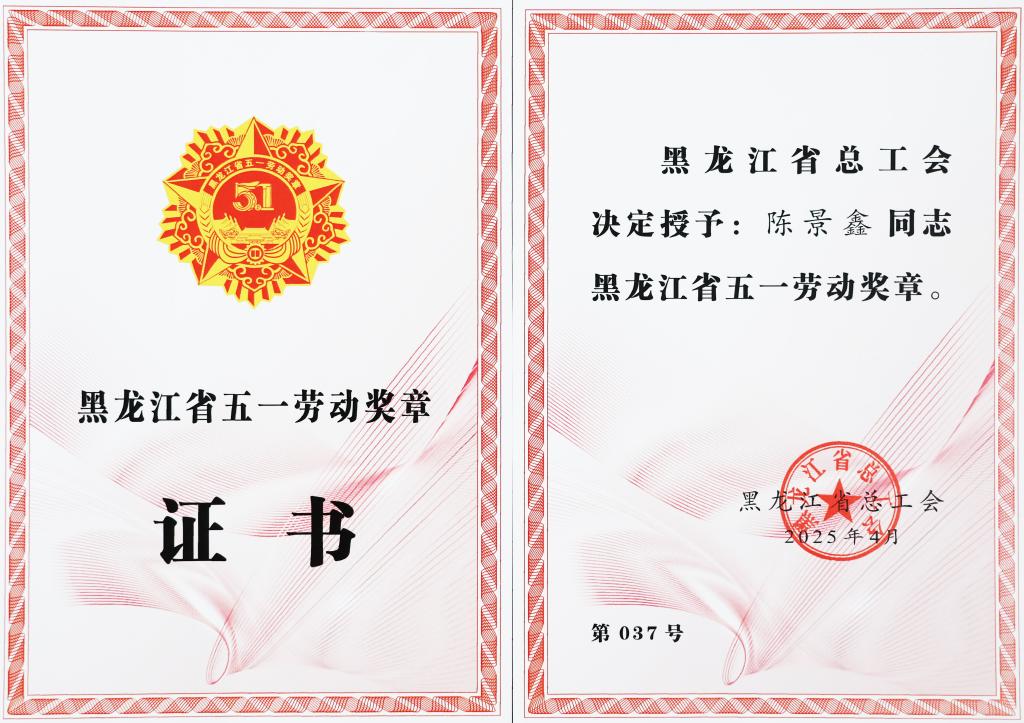 4月29日,永远跟党走 奋进新征程——庆祝中华全国总工会成立100周年省五一劳动奖、工人先锋号颁奖暨第二届“龙江工匠年度人物”发布仪式在黑龙江广播电视台演播厅举行。永利党委副书记、副院长陈景鑫荣获黑龙江省五一劳动奖章。齐齐哈尔市共有九名各行业人员获此殊荣。