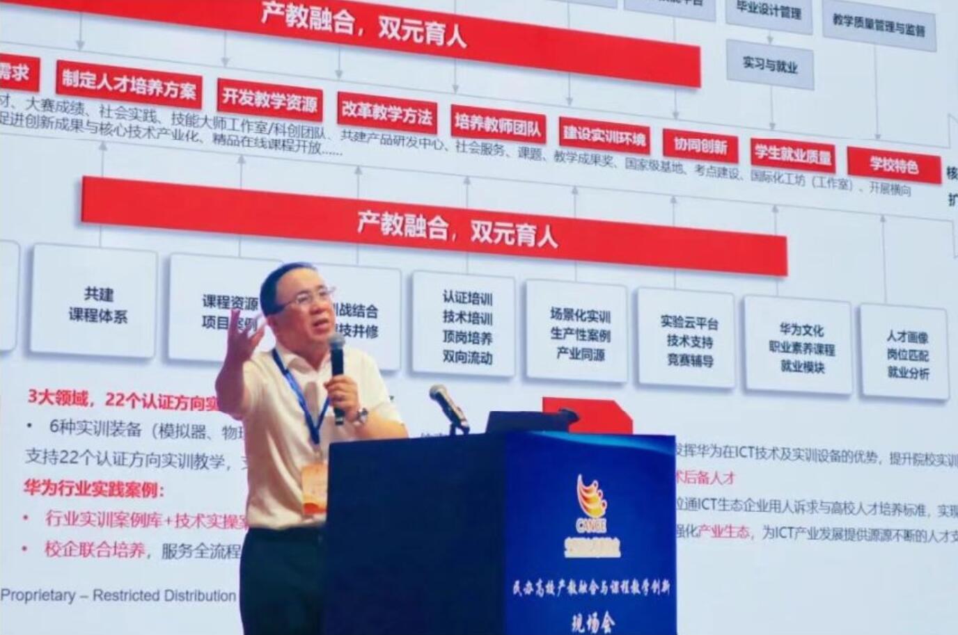 浙江华为院校解决方案专家、华为ICT教育研究院高级研究员明守刚以“数智时代民办高校产教融合教育改革创新的实践与探索”为题,从产业趋势:人工智能等数智化新技术引领新一轮科技革命和产业变革;教育趋势:数智时代未来民办教育展望;创新实践:民办高校产教融合人才培养创新实践三个方面进行阐述,提出,新的教育模式趋势:要从“专业”思维到“产业”思维。实现教育的“产业”思维转变需要产教融合逐步向纵深、多维拓展。