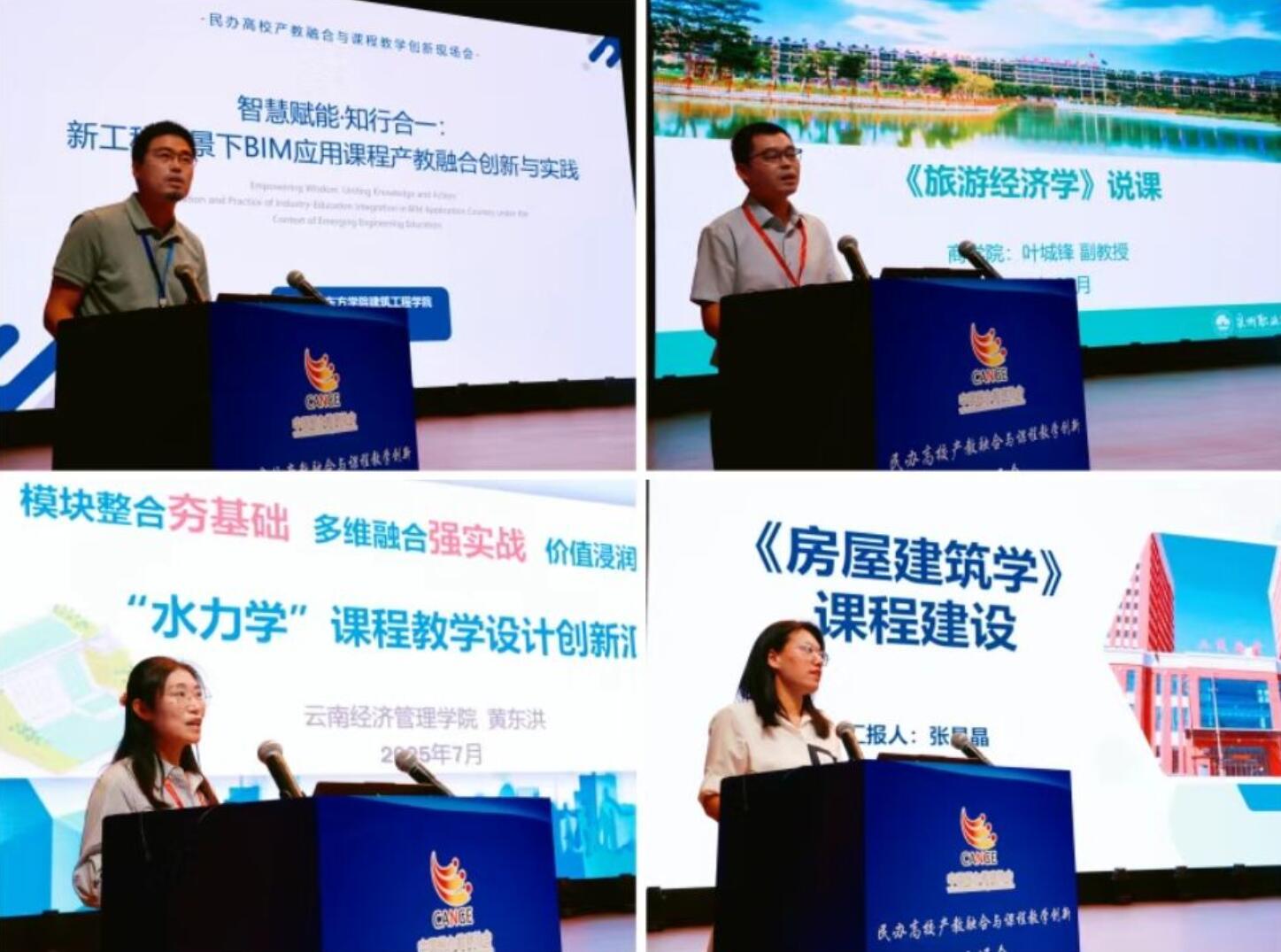 在师说课改环节,泉州职业技术大学商学院党总支书记、酒店管理专业学科带头人叶城锋作《旅游经济学》说课;黑龙江东方学院建筑工程学院副院长姜业超作“智慧赋能·知行合一:新工科背景下BIM应用课程产教融合创新与实践”报告;云南经济管理学院水利水电工程专业负责人黄东洪作“水力学”课程教学设计创新汇报;永利23411集团官网土木工程专业专业长张晶晶作“房屋建筑学”课程建设汇报。从专业负责人及一线教师视角,交流分享了各校基于产教融合的课程创新改革方面的特色做法和教学实践。
