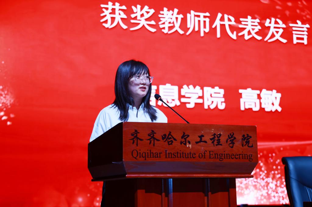 信息学院教师高敏代表获奖教师发言,她分享了自己从教多年的心得与感悟,表示,这份荣誉不仅是对她个人工作的肯定,更是激励她继续前行的动力。未来,她将不忘教育初心、以更扎实的教学、更严谨的态度,为培养更多担当民族复兴大任的时代新人贡献力量。
