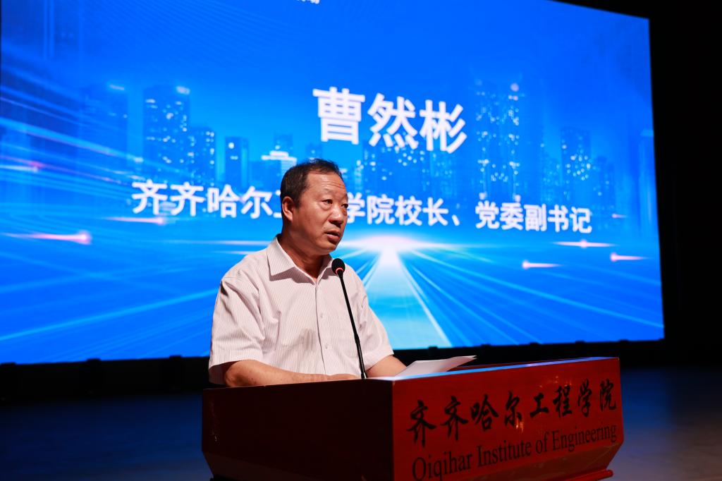 学校校长、党委副书记曹然彬致辞。他代表全校师生向出席活动的领导、嘉宾致以热烈欢迎和诚挚感谢。他在讲话中回顾了学校发展历程,指出,学校创校34年来,始终秉承“艰苦创校、课程立校、文化治校、精神兴校、信仰传校”的传统,坚持“政校企合作、产学研融合、教学做合一”办学模式,推进产教融合从1.0版向3.0版迭代升级,积极探索“海绵式”学校、“创业型”大学建设之路。积极服务地方发展与科学普及,已建成省级科普研学路线,多项课程入选“龙江科普前沿讲堂”,师生在科普创新竞赛中屡获佳绩。学校将以此次科普月为契机,进一步整合资源、创新形式,打造一批有影响力的科普品牌活动,诚挚欢迎广大市民尤其是青少年走进校园,感受科学魅力。
