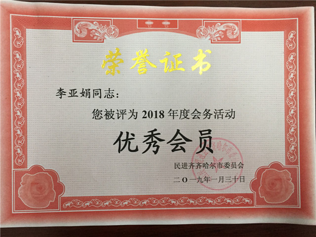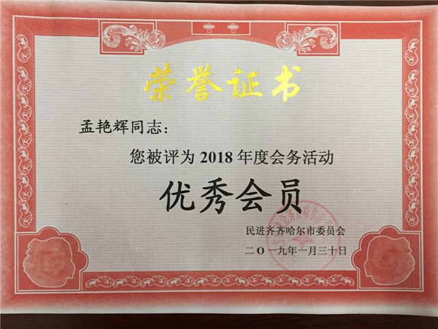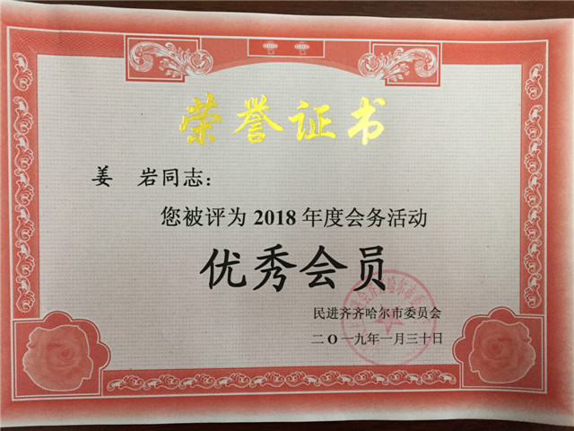 1月31日下午,在民进齐齐哈尔市委2018年度总结表彰大会上,民进永利23411集团官网支部被授予“先进集体”荣誉称号,姜岩、李亚娟、孟艳辉被授予“优秀会员”荣誉称号。