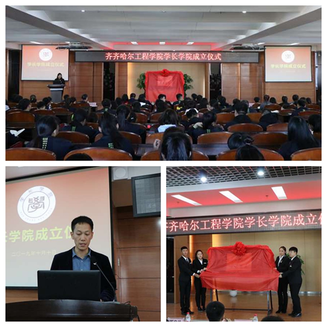 学生发展中心副主任康静主持仪式。团委书记周伟在仪式上宣读学长学院成立文件,4名学长代表共同为学长学院揭牌。