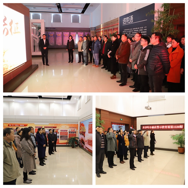 在齐齐哈尔廉政警示教育基地第1220期展厅里,学院校级领导、各部门正职或主持工作的副职、各党总支书记和直属支部书记,由讲解员引领观看了“辉煌不忘来时路”“砥砺奋进新征程”“不忘初心、牢记使命”“有腐必惩、有贪必肃”“鹤城警钟”“忏悔录”“处分墙”“算好人生七笔账”“时代楷模、勤廉榜样”等图文与视频并认真听取讲解员的解说,一行行文字、一张张照片、一段段视频、一件件实物……从正反两个方面让大家的精神受到洗礼,并在交流中表示:作为领导干部,必须树立廉洁自律意识,筑牢拒腐防变防线,以那些违纪违法案件为戒,做到守初心、担使命,向时代楷模看齐,发挥先锋模范作用,牢固树立“四个意识”、坚定“四个自信”、做到“两个维护”,把学院的教育教学工作推向新的高度。