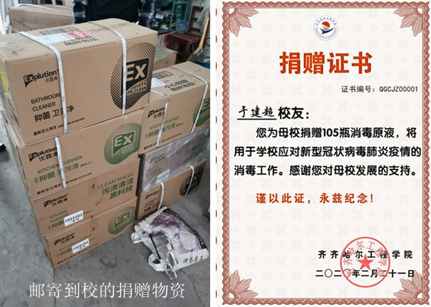 笔者通过电话联系到于建超,请他说一下事情的缘由。于总经理说,前些天他驾车外出办事,在路上收听交通广播听到一条关于武汉一所大学正在为下一步防疫工作筹备消毒液的新闻,一下让他想起了远在千里之外的母校,那里也一定需要这样的防疫物资,而自己眼下有办法有能力来做这件事。于是,就有了他和侯老师通话的一幕。随后,他又与学校校友会取得联系,并经过多方筹备把捐赠物资迅速邮发过来。