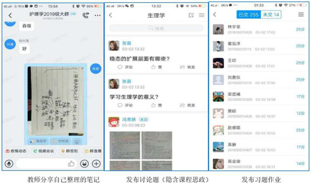 2、课中与学生“共舞”。采用钉钉直播屏幕共享的方式进行直播教学,其中穿插着观看慕课视频,教师利用钉钉白板做知识框架的总结,课堂连麦,互动面板答题,投票等教学环节,带领学生跟着教师的节奏,从而实现教学目标。同时在授课过程中不忘培养学生对专业的深入认知,通过永利护理学专业的毕业生现在各地一线对抗疫情的故事,让学生明白医学生的责任感和使命感。课程思政实例:如护理学 2017 届毕业生高鑫支援武汉抗击疫情一线。