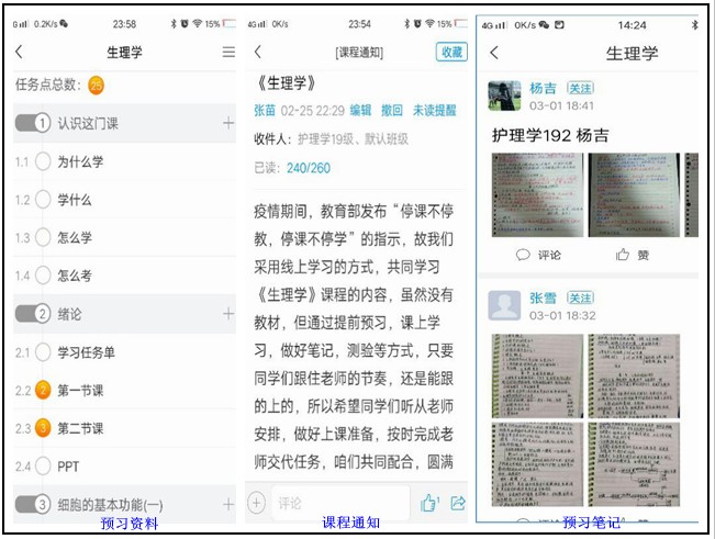 1、课前做好准备。首先,教师选择并研究适合的教学平台,并设计教学思路。本门课程,教师根据学生已有的平台,结合教师对平台的掌握情况,选择了学习通+钉钉两个平台。同时按照教学思路建设教学资源,包括教学视频、PPT、学习任务单、通知、测验、作业、讨论题等,教师引导学生进行提前预习,提前让学生进入学习状态,并通过检查学生传入学习通的预习笔记,了解学生的预习情况,为课堂直播教学奠定基础。