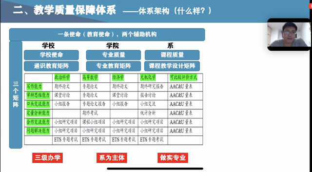 本次思享汇活动学习内容为:基于学习效果的全校统一质量保障体系建设,基于学习效果的美国大学课教学评价方法。王丹处长在领学中首先提出观点:大学旨在帮助学生构建学习模型,并分别就一个使命、两个辅助机构、三个矩阵,阐述了建设质量保障体系的内涵。