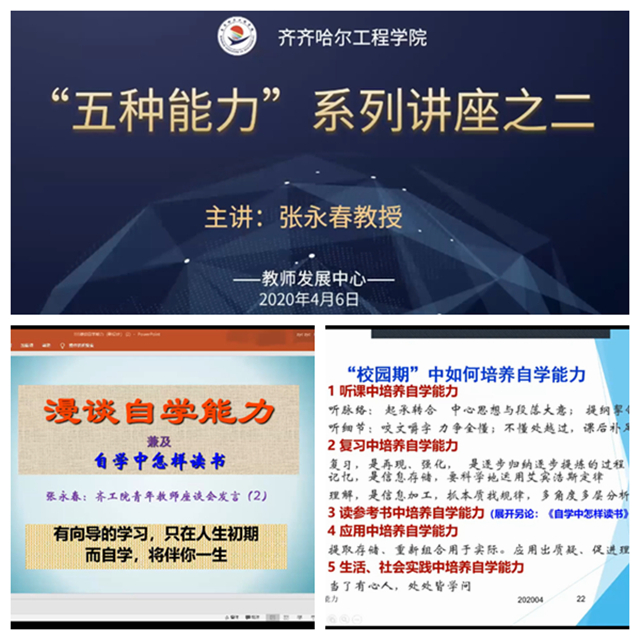 4月6日下午,张永春教授“五种能力”系列讲座之漫谈自学能力讲座以在线方式进行,学校近400位教职工参加学习,副院长张振笋主持活动。