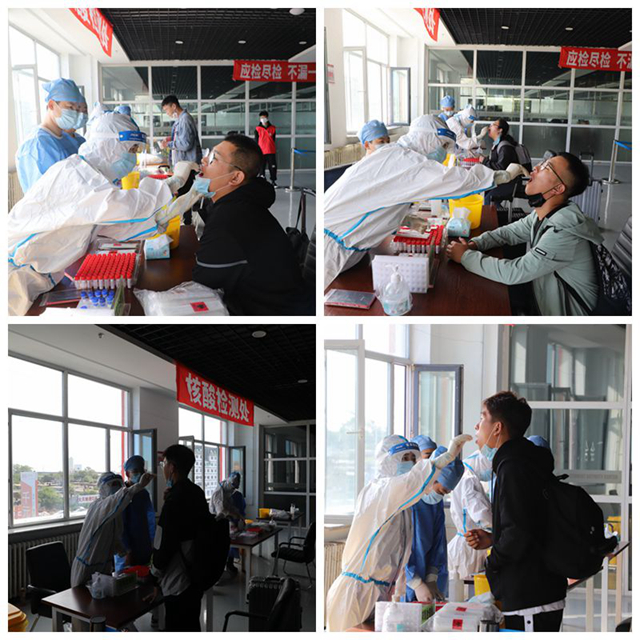 第二批返校学生是计划3个批次中人数最多的,学校本着“应检尽检,一人不落”的原则,严格执行核酸检测流程不走样。学生工作处提前统一制作下发《入校核酸检测卡》,并对检测卡编号管理。各系返校学生按照到校顺序,在报到通道用手机扫描“龙江健康码”,经工作人员测量体温合格、核验身份无误后,领取检测卡与检测条码,随即按要求到紧邻的指定检测点出具核酸检测卡,上交检测条码接受属地建华医院医务人员所做核酸检测。检测后,按照10人一组,进入指定等候区等待检测结果。