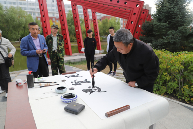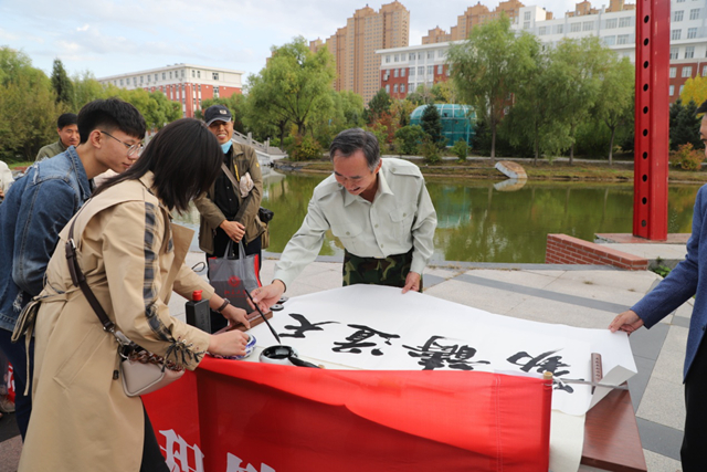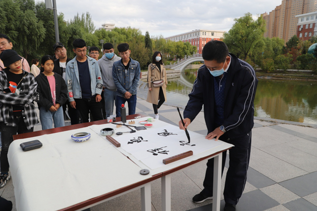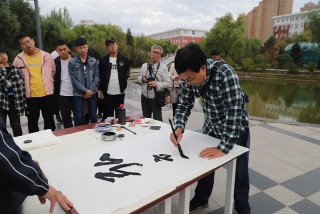 9月24日下午,由校党委宣传部与团委联合举办,齐工程书法爱好者协会承办的学校建校三十周年系列活动之“秋到易湖畔·墨香飘校园”——鹤城书法家齐工程笔会在永利举行。