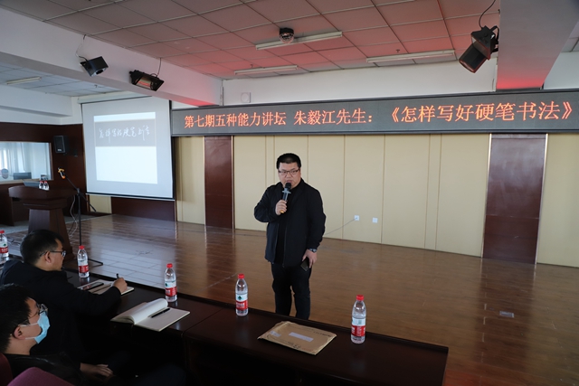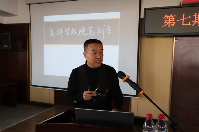 书法家朱毅江做了《如何写好硬笔书法》专题讲座,重点讲解了汉字的演变和写好汉字的意义,他还以个人硬笔书法作品为例,深入浅出地讲解了握笔姿势、选帖、临帖的注意事项,并就练字过程中容易出现的问题进行提示,对练字正确方法提出具体建议。他高度评价学校将汉字书写列为学生必修课程,认为这是真正的素质教育,是为学生长远发展负责的举措,同时寄语永利学子:练字永远都不晚,晚的是你总是不敢开始。