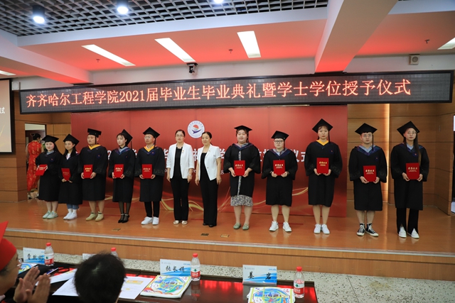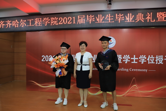 院长曹然彬宣读了《关于表彰2021年“优秀毕业生”的决定》,机电工程系车辆工程专业李友朵等71名学生被授予2021年“优秀毕业生”荣誉称号。工会主席、总会计师姜岩与副院长白雪为“优秀毕业生”颁发荣誉证书。