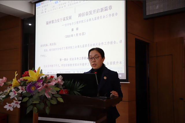 工会主席姜岩作学校工会第九届委员会工作报告,从加强思想政治引领,聚焦学校高质量发展,持续推进民主管理特色发展,关心教职工福祉等方面,全面总结过去五年来学校工会工作取得的成绩,并从坚持服务大局、服务学校、服务教工,开创学校各项事业发展新局面出发,围绕坚定政治方向,推进职工思想政治引领新实践;正确分析形势,深刻认识工会组织肩负的新使命;乘势而上,不断开创未来五年工会工作新局面三个方面,提出学校工会的工作设想。