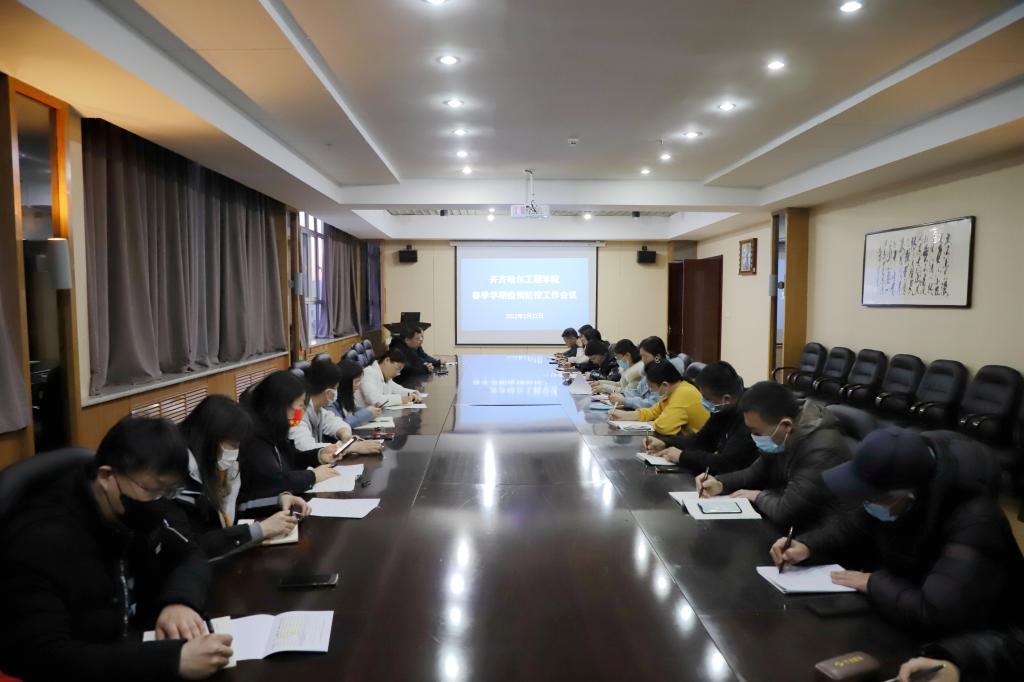为认真贯彻落实黑疫指办发〔2022〕25号文件、省教育厅《关于严实精准做好2022年春季学期学校开学时段疫情防控工作的通知》和市防指《在齐高校工作提示》内容相关要求,2月22日17点,学校在图书馆603南会议室召开春季学期疫情防控工作会议,学校院长曹然彬、党委书记郭伟东、工会主席姜岩、副院长张振笋、白雪,相关部门负责人和各系主任参加会议,会议由院长曹然彬主持。