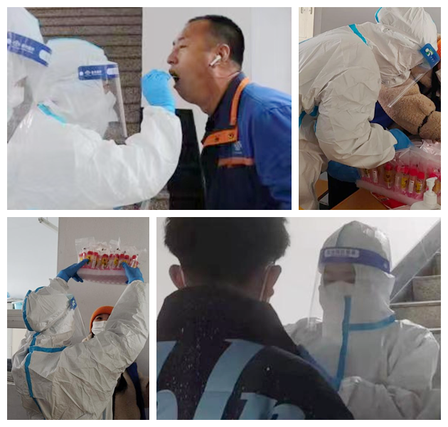 她来到核酸采集地点,在社区临时搭建的简易帐篷内换上防护服后,立即开始了核酸检测采样工作。当时室外温度为零下十度左右,她认真地为居民采集核酸。采集核酸后必须一人一消,她的手冻得通红麻木已没有知觉,防护面屏上也挂满了霜花,但她没有叫苦叫累,更没有退缩。