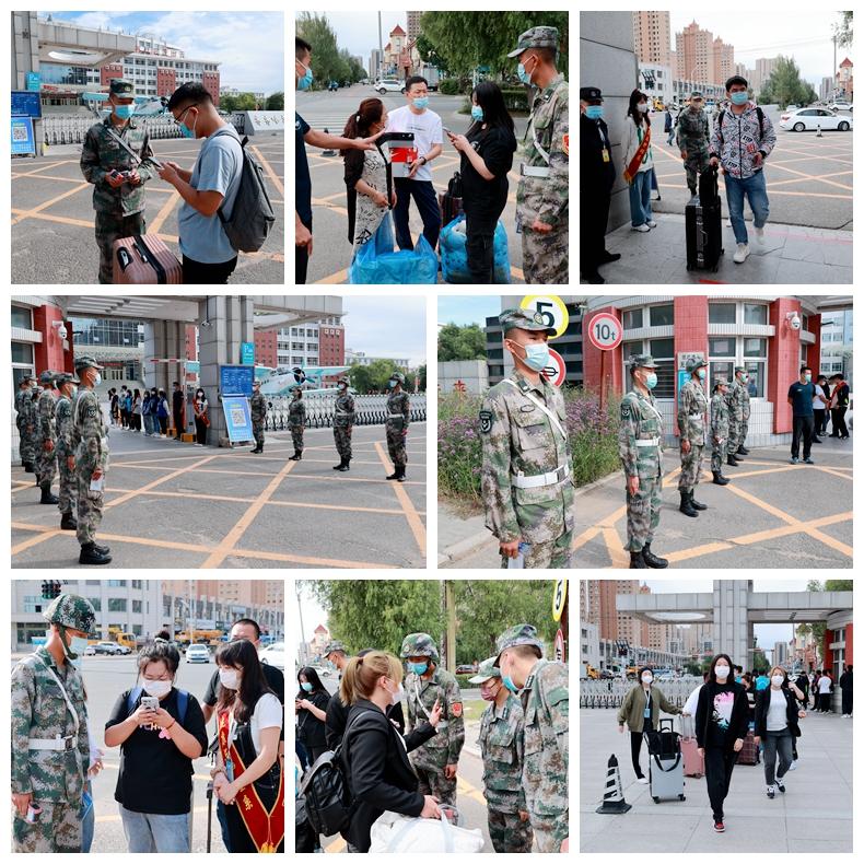 按照疫情防控要求,学长教官团对新生逐一扫码测温,严格检查新生48小时内有效的核酸检测阴性证明、通信大数据行程卡和龙江健康码绿码等。