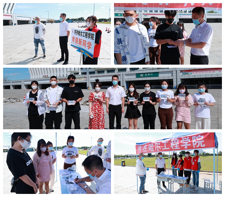 为及时给新生送来学校的第一缕温暖,保障迎新工作有序有效,学校领导及工作人员分别在齐齐哈尔火车站、火车南站、飞机场迎接新生,同时安排大巴车,从早8点开始,循环往返于学校和车站、机场,保证将新生安全送达学校。