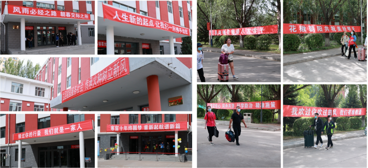 学校图书馆大屏幕上滚动播放着欢迎标语,楼门前、道路两旁悬挂着迎新条幅,校园内处处洋溢着新生报到的喜庆气氛。