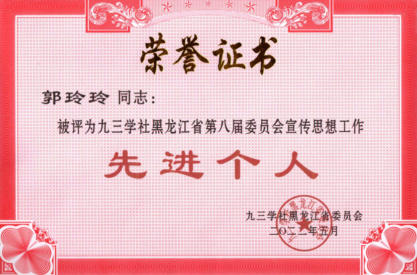 杨静霞老师被评“九三学社黑龙江省第八届委员会组织工作先进个人”。杨老师积极发展新社员,多次组织社员开展党史学习教育、黑龙江省高校思想政治工作专题培训、社会公益捐赠等活动。