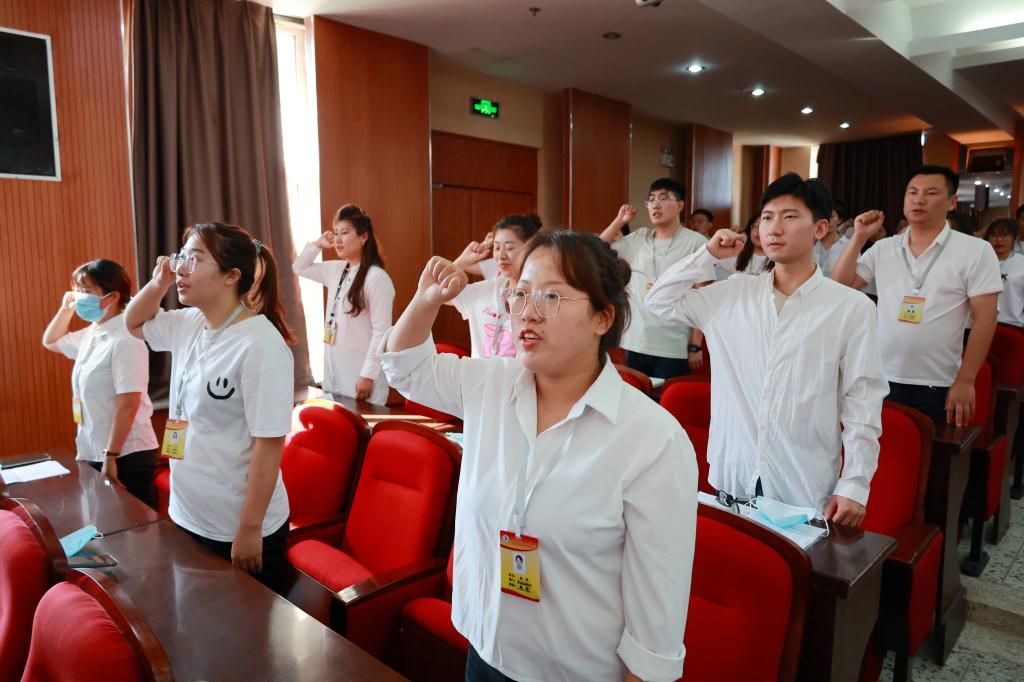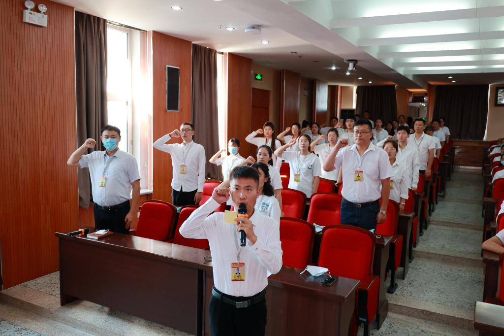 新教师代表李春雨带领所有新入职教师,在全校教职工的见证下,高举右手,面对国旗庄严宣誓,立志做光荣的人民教师,忠于人民的教育事业,履行教师的神圣职责。