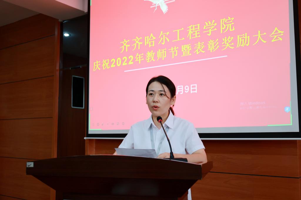 建筑工程系郝丽娜老师代表获奖教师发表感言。首先对学校表达了感谢之情,结合自身的工作经历,表示将坚持育人尽责,用仁德之心铺学生成长之路;坚持育人有爱,做学生生活成长的引路人;坚持育人得法,做学生终生学习的同路人;坚持做好专业教师及生涯导师的本职工作,更好地服务专业,为学校的发展贡献力量。