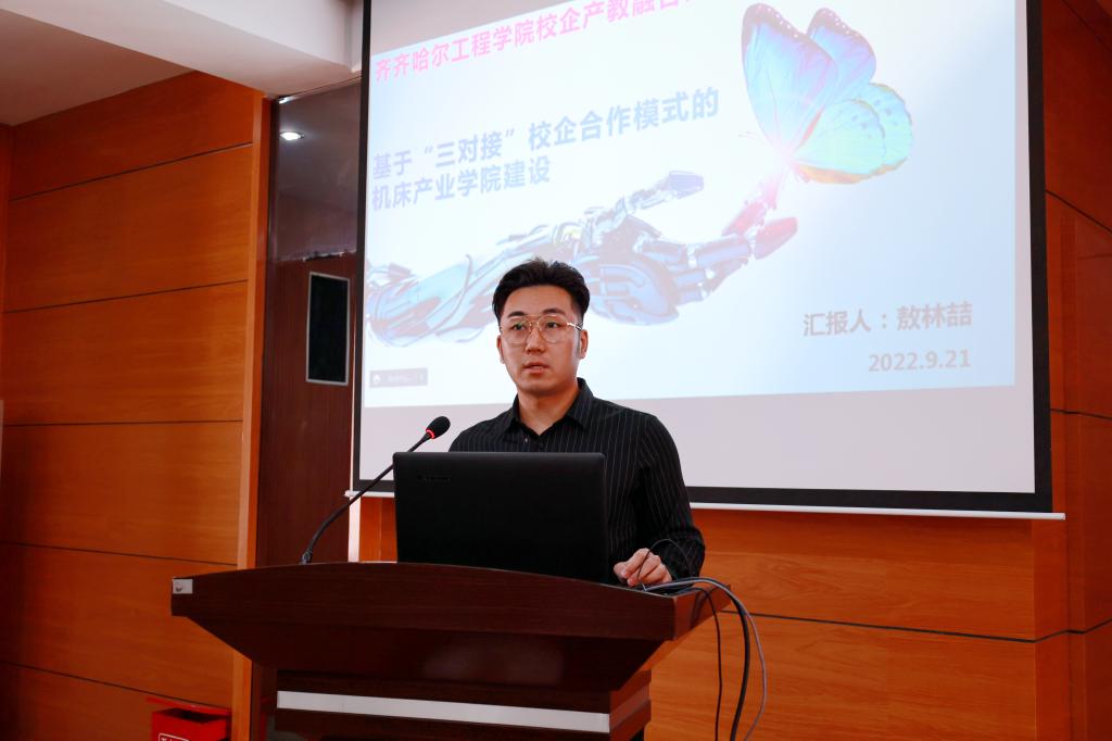 机电工程系敖林喆老师作了《基于“三对接”校企合作模式的机床产业学院建设》的主题汇报,他从机床产业学院的建设背景、建设情况、建设成效出发,阐述机床产业学院是如何做到专业与产业对接,教学过程与生产过程对接,课程内容与职业标准对接,实现了产教融合。