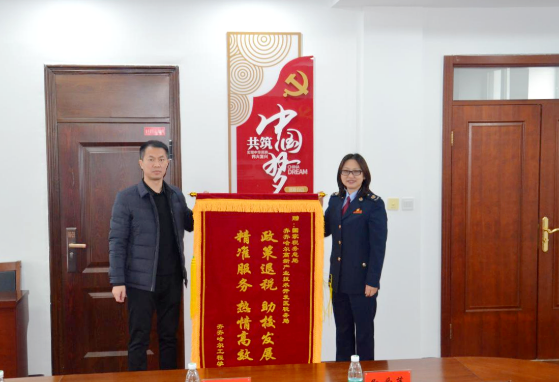 11月11日,永利23411集团官网党委书记郭伟东、工会主席、总会计师姜岩带队将一面写着“政策退税,助校发展;精准服务,热情高效”的鲜红锦旗送到齐齐哈尔高新产业技术开发区税务局局长谷学超手中。