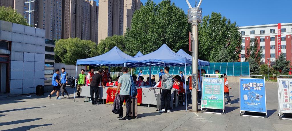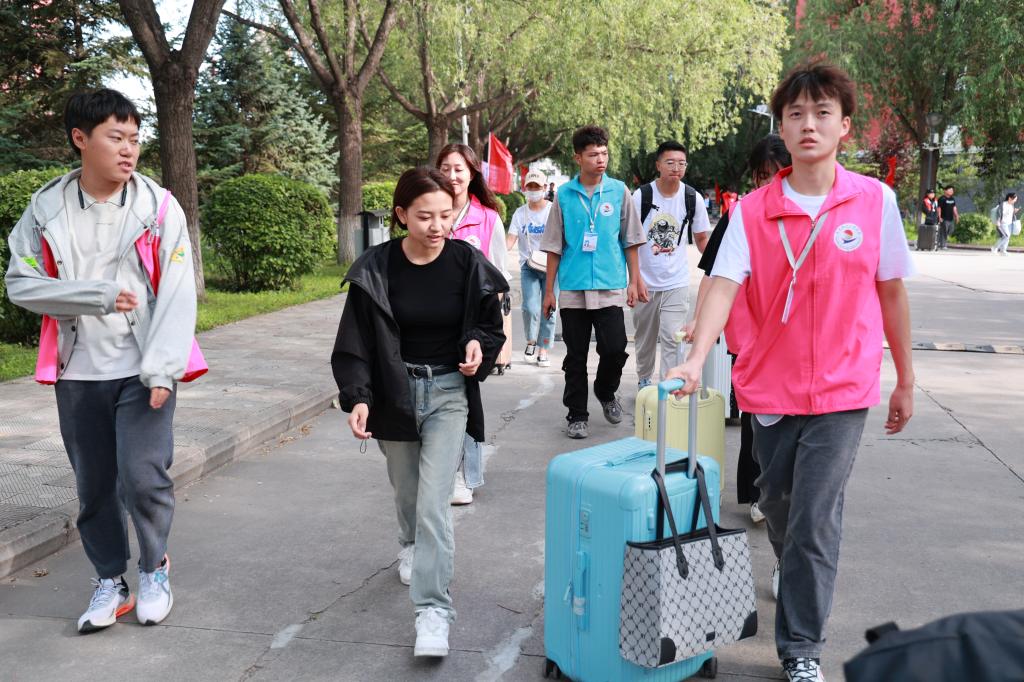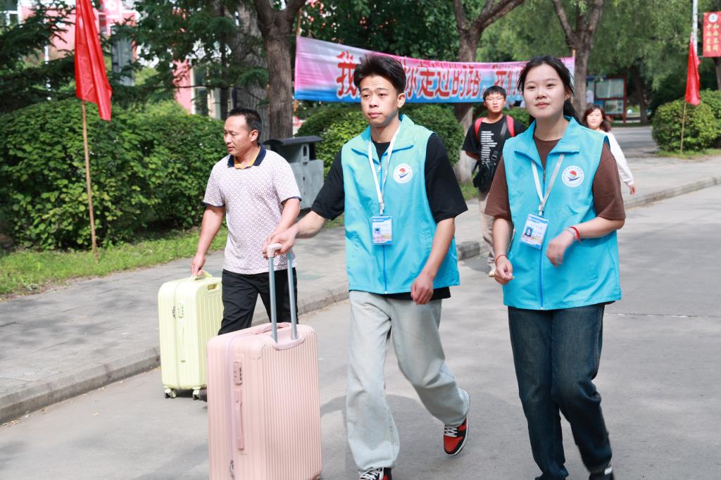 报到当天,学校在南门设立了接引点,老师、辅导员、志愿者们不断地穿梭在迎新现场,为新生提供热情周到的服务。