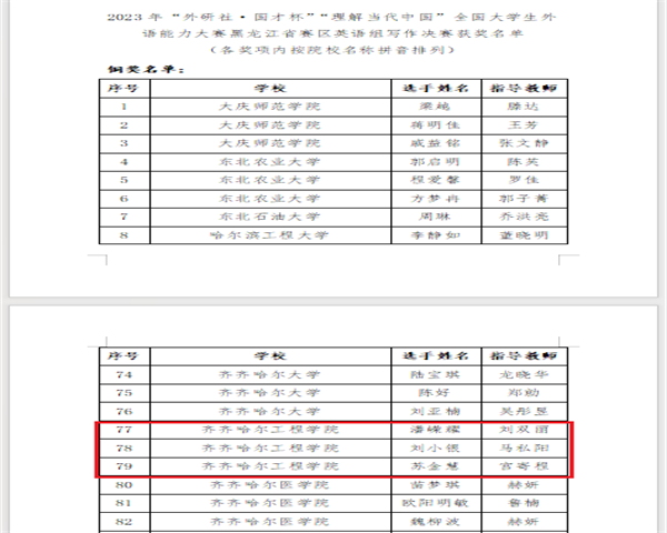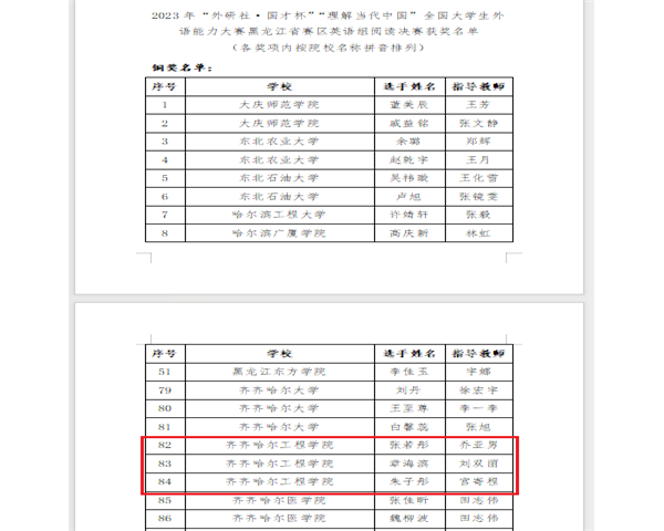 近日,2023年“外研社·国才杯”“理解当代中国”全国大学生外语能力大赛黑龙江省赛区英语组决赛获奖名单结果揭晓。永利土木工程221班陈自豪、工程管理221班胡东荣获黑龙江省赛区英语组演讲决赛铜奖;机器人231班潘嵘耀、风景221班刘小银和机械221班苏金慧荣获省赛区英语组写作决赛铜奖;护理学221班张若彤、工管211班章海滨和电气223班朱子彤荣获省赛区英语组阅读决赛铜奖。