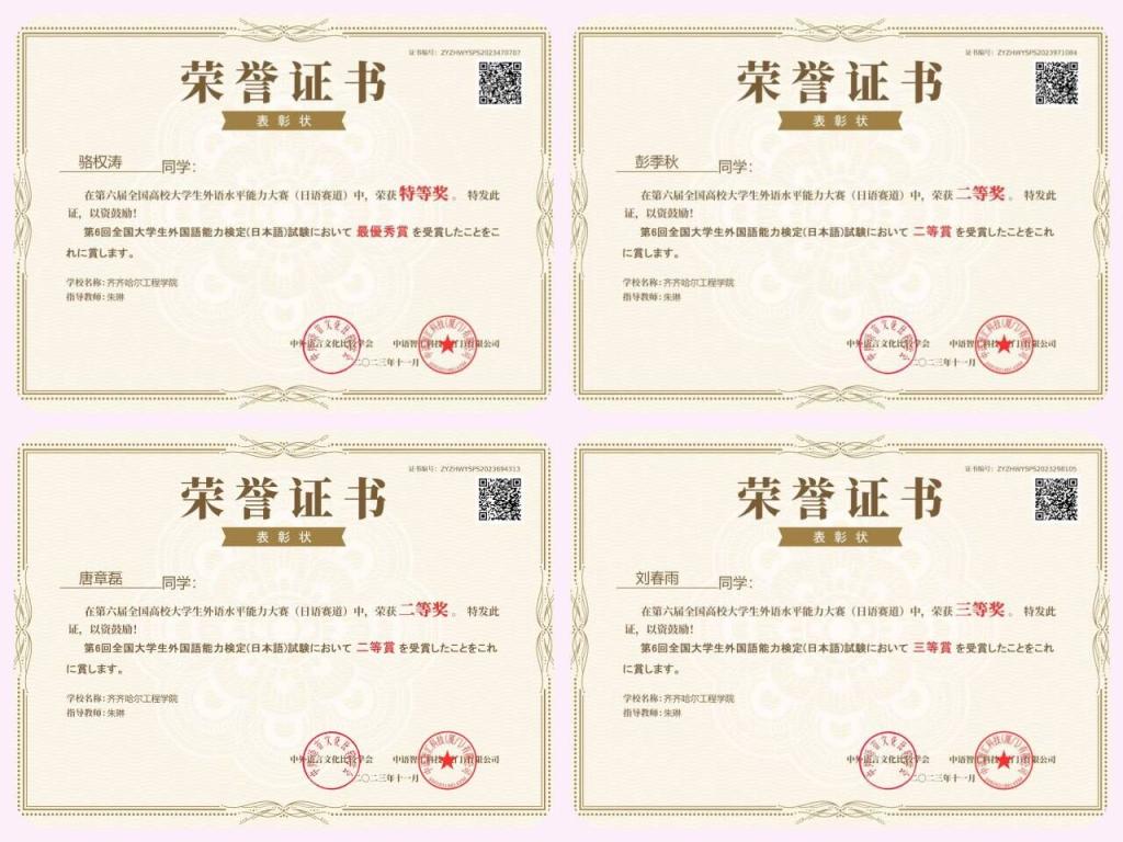近日,第六届全国高校大学生外语水平能力大赛成绩揭晓,管理工程系英语专业的骆权涛同学在日语赛道获得特等奖;彭季秋和唐章磊同学获得二等奖;刘春雨等八名学生以及信息工程系计科231班黄岚、计科232班秦川东、计科233班肖婷获得三等奖;永利荣获“最佳院校组织奖”;朱琳老师荣获“优秀指导教师称号”。