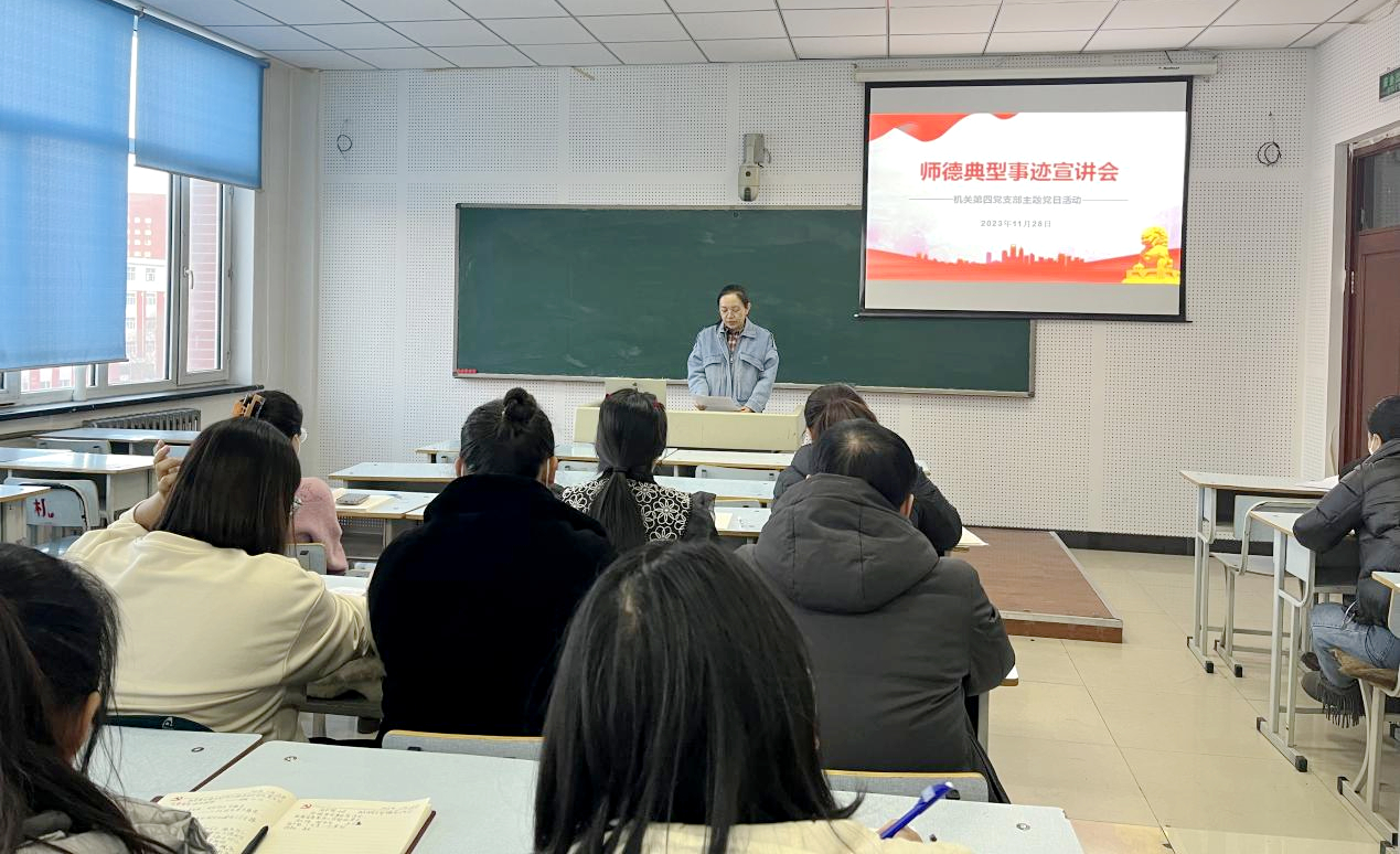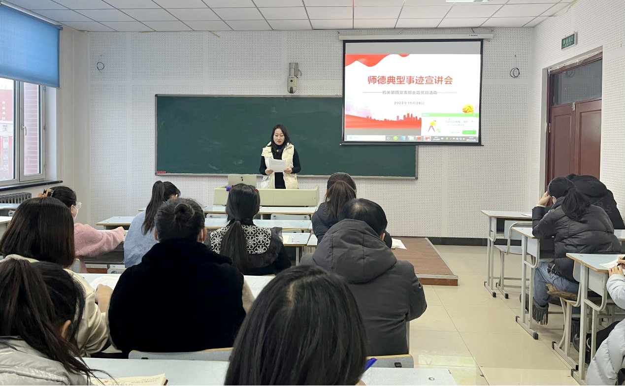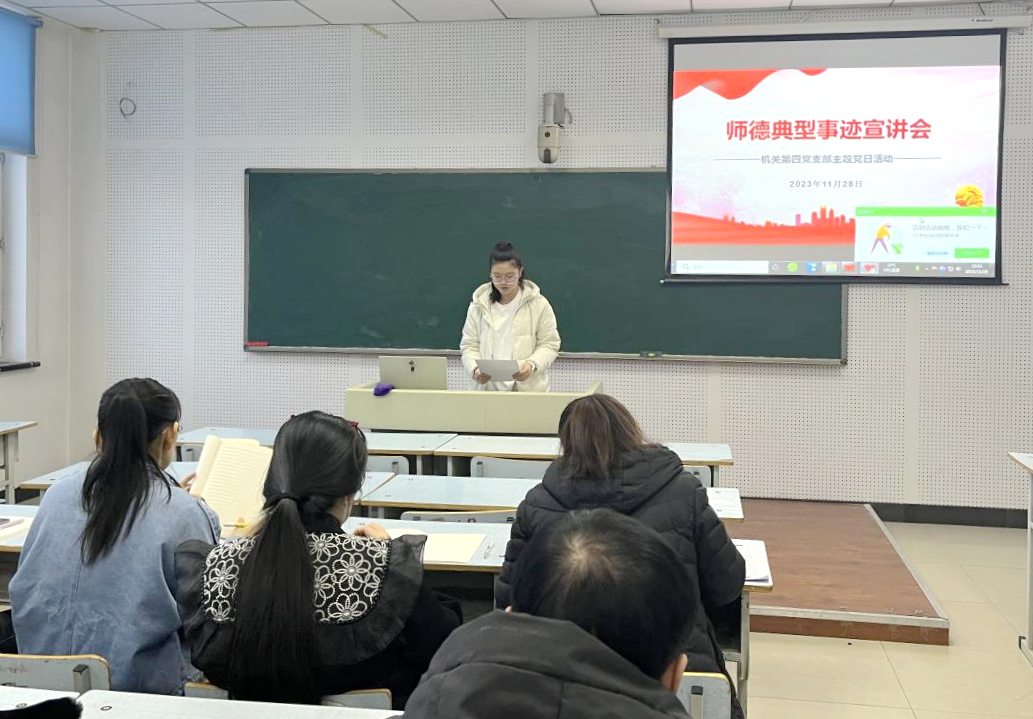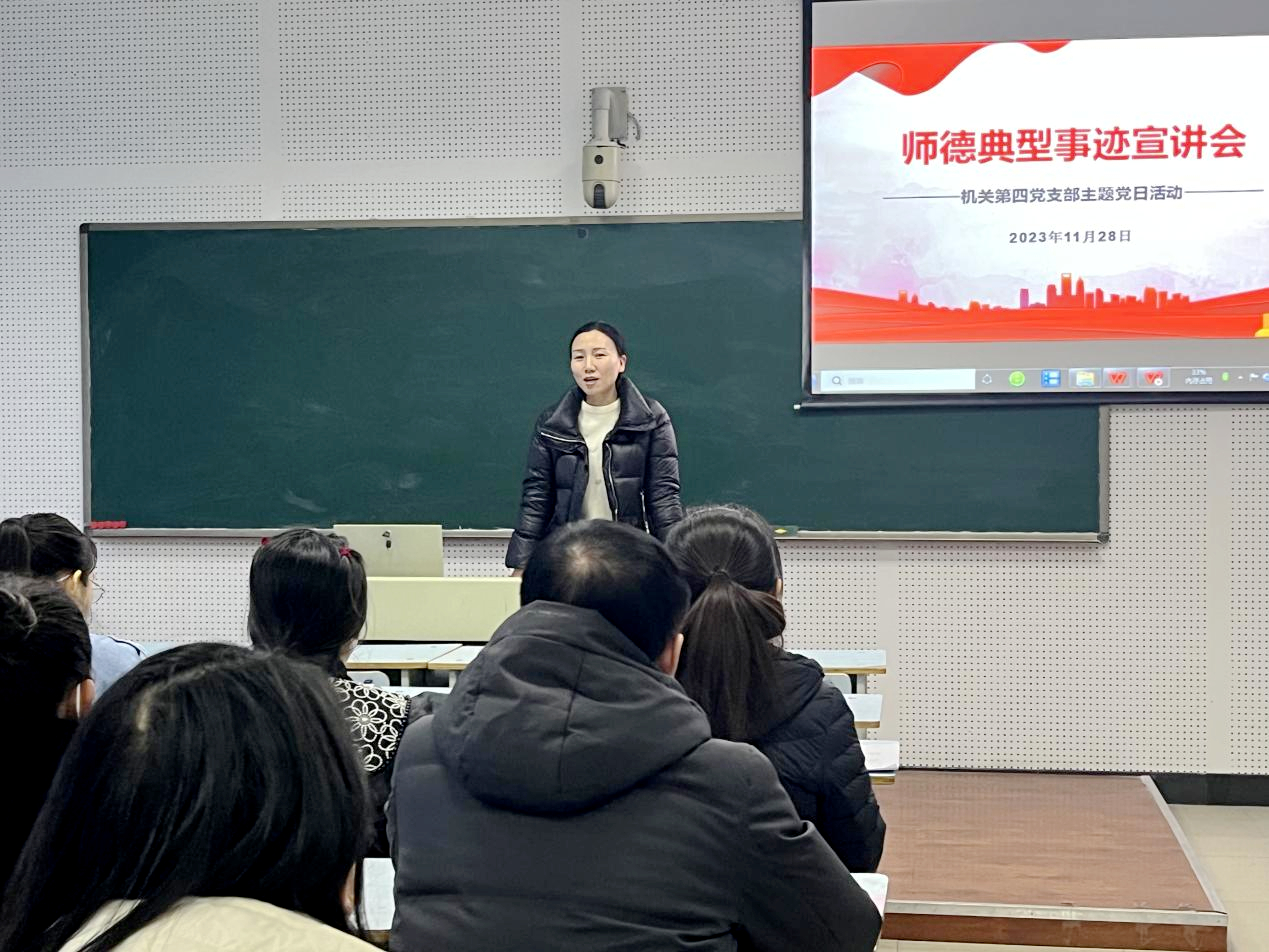 11月28日,机关第四党支部在图书馆410室开展主题党日活动,本次活动主题是“师德典型事迹宣讲会”,机关第四党支部所辖部门全体人员以及资产管理处、财务处、总务处、保卫处、基建办参会,支部宣传委员孙爱萍主持。