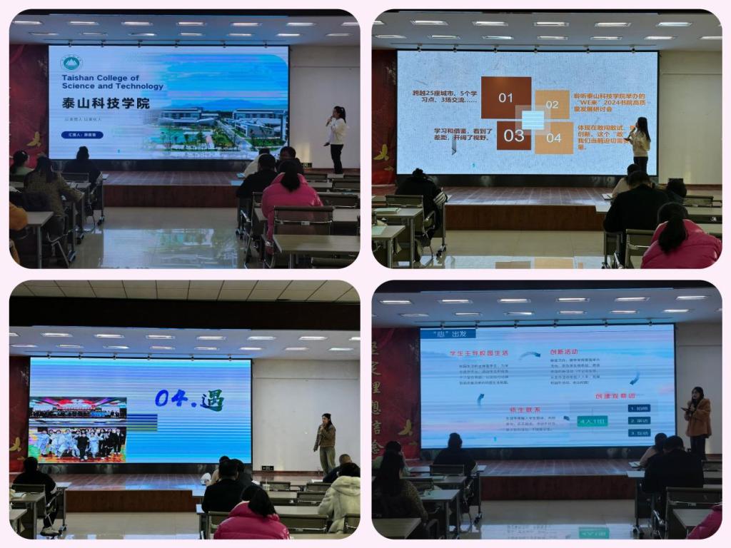 张云惠老师从泰山科技学院的校园活动入手,从育人空间建设、成果物化及学生活动体系建设三个方面重点阐述考察过程中的所见、所闻、所感;团委王雪老师介绍了泰山科技学院“完满教育”育人体系,并与永利社团建设、青年志愿者服务建设进行对比,结合永利特色及审核评估要求制定出新学期团委活动计划;健康与护理系辅导员李安琪着重强调环境育人的重要性,提出在新学期工作中要进一步发挥环境育人的优势,以学生的兴趣和需求为主体开展系列工作;管理工程系辅导员刘天缘结合此次考察学习提出下一阶段工作思路:以“心态度”服务学生、以“心深度”激发活力、以“心观察”走近学生,并制定了新学期“一系一特色”专属系列活动方案;建筑工程系辅导员宋雪微表示在新学期开展各项工作时,要始终思考新情况、新问题,要结合学情制定活动方案,利用校外资源,整合校内资源,努力形成品牌;信息工程系辅导员薛苗苗以“美育”为抓手进行分享,表示通过此次考察学习体会到了“书院制”育人的成效与创意,在新学期将围绕“美育”开展系列特色活动,为学生提供更多美育机会;学生工作处高景阳老师对泰山科技学院营地教育中心、师资力量、素质拓展训练课程等方面进行介绍,并对下一阶段工作计划有了详细部署。