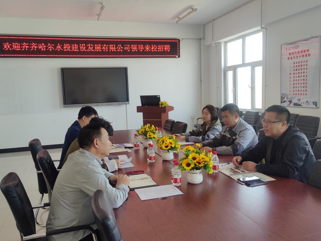杜昌明高度赞赏了永利的人才培养模式和学生的实践能力,并介绍了齐齐哈尔水投建设发展有限公司的发展情况。该公司一直致力于水利工程、市政基础设施等领域的投资、建设和运营情况。他表示,非常愿意与学校开展校企合作,实现资源共享、优势互补,促进人才培养和企业发展的双赢。随后,该公司总工程师孙长利、综合办公室主任王静,就此次来校招聘的相关工作进行了介绍。此次齐齐哈尔水投建设发展有限公司计划招聘10名土木工程施工技术人员,主要从事现场施工管理、施工技术人员、预算员、办公室人员共四个岗位。