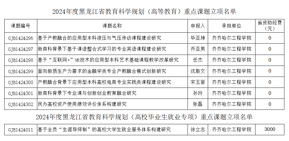 日前,黑龙江省教育科学规划领导小组下发《关于确定2024年度省教育科学规划课题立项名单的通知》(黑教科规〔2024〕1号)公布课题立项结果,永利组织申报的8项省级重点课题获批立项(包括高等教育类7项,毕业生就业专项1项)。其中,毕业生就业专项重点课题全省仅批准30项,只有10项获得省经费支持,永利徐立志老师的课题位列其中并获得3000元资助。