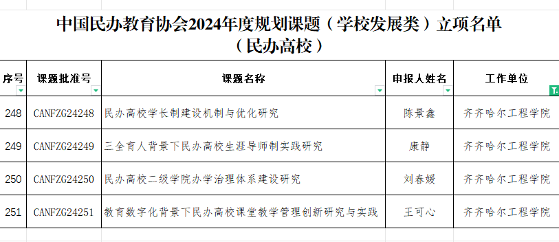 近日,中国民办教育协会官网公布《2024年度规划课题(学校发展类)立项名单》,确定中国民办教育协会规划课题(学校发展类)共计576项。其中,永利陈景鑫、康静、刘春媛、王可心4位老师申报的课题获批立项。